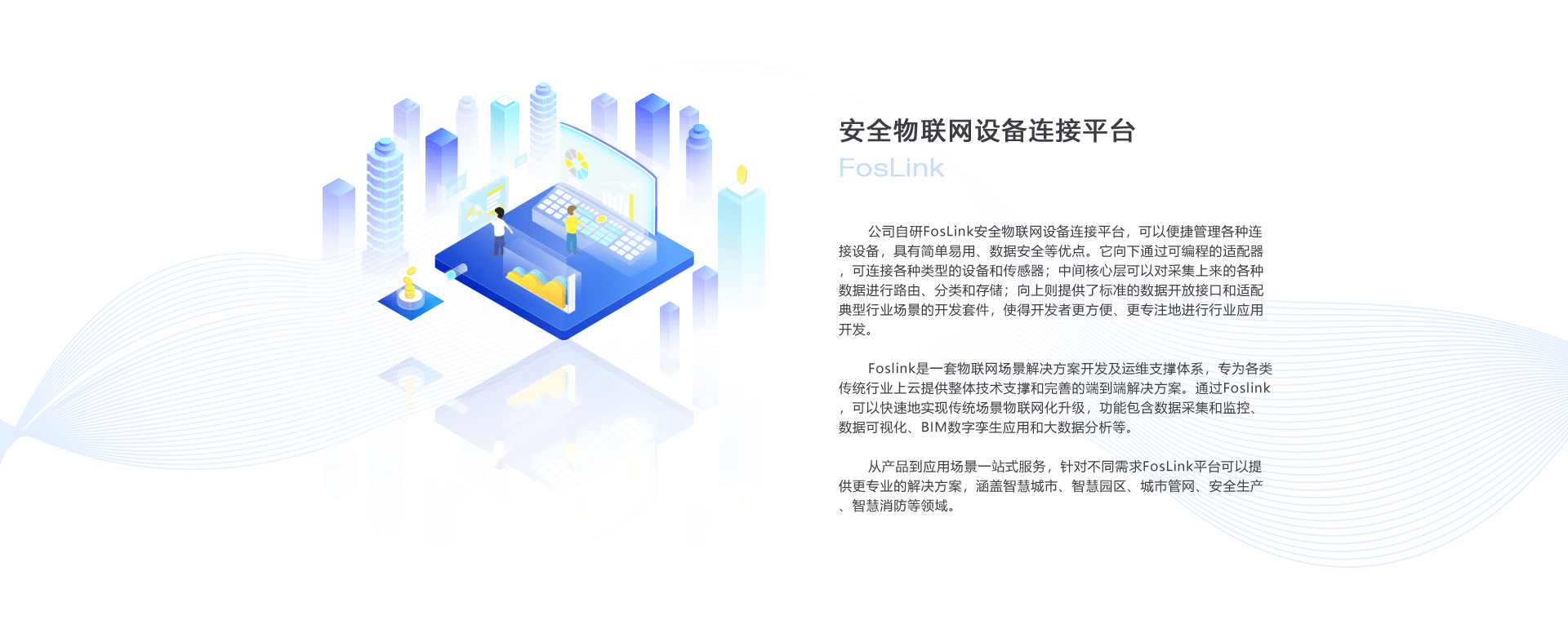Foslink是一套物聯(lián)網(wǎng)場(chǎng)景解決方案開(kāi)發(fā)及運(yùn)維支撐體系,專(zhuān)為各類(lèi)傳統(tǒng)行業(yè)上云提供整體技術(shù)支撐和完善的端到端解決方案。通過(guò)Foslink,可以快速地實(shí)現(xiàn)傳統(tǒng)場(chǎng)景物聯(lián)網(wǎng)化升級(jí),功能包含數(shù)據(jù)采集和監(jiān)控、數(shù)據(jù)可視化、BIM數(shù)字孿生應(yīng)用和大數(shù)據(jù)分析等。